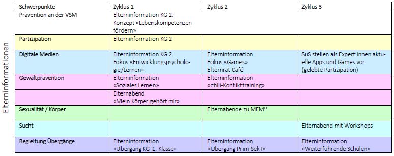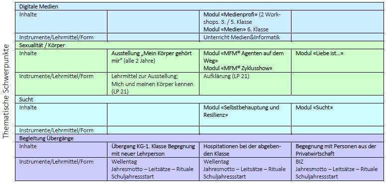 Die aufgeführten Massnahmen und deren Zusammenhänge sind mit den gesundheitsfördernden Elementen des Lehrplans 21 abgeglichen und werden von einem dafür eingesetzten Fachausschuss regelmässig überprüft und angepasst.
