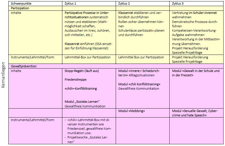 Der Aufbau von gesundheitsförderlichen Verhaltensweisen muss die Entwicklungsstadien der Schülerinnen und Schüler berücksichtigten und setzt ein verträgliches Lern- und Lebensklima in den Klassen und im Schulhaus voraus.